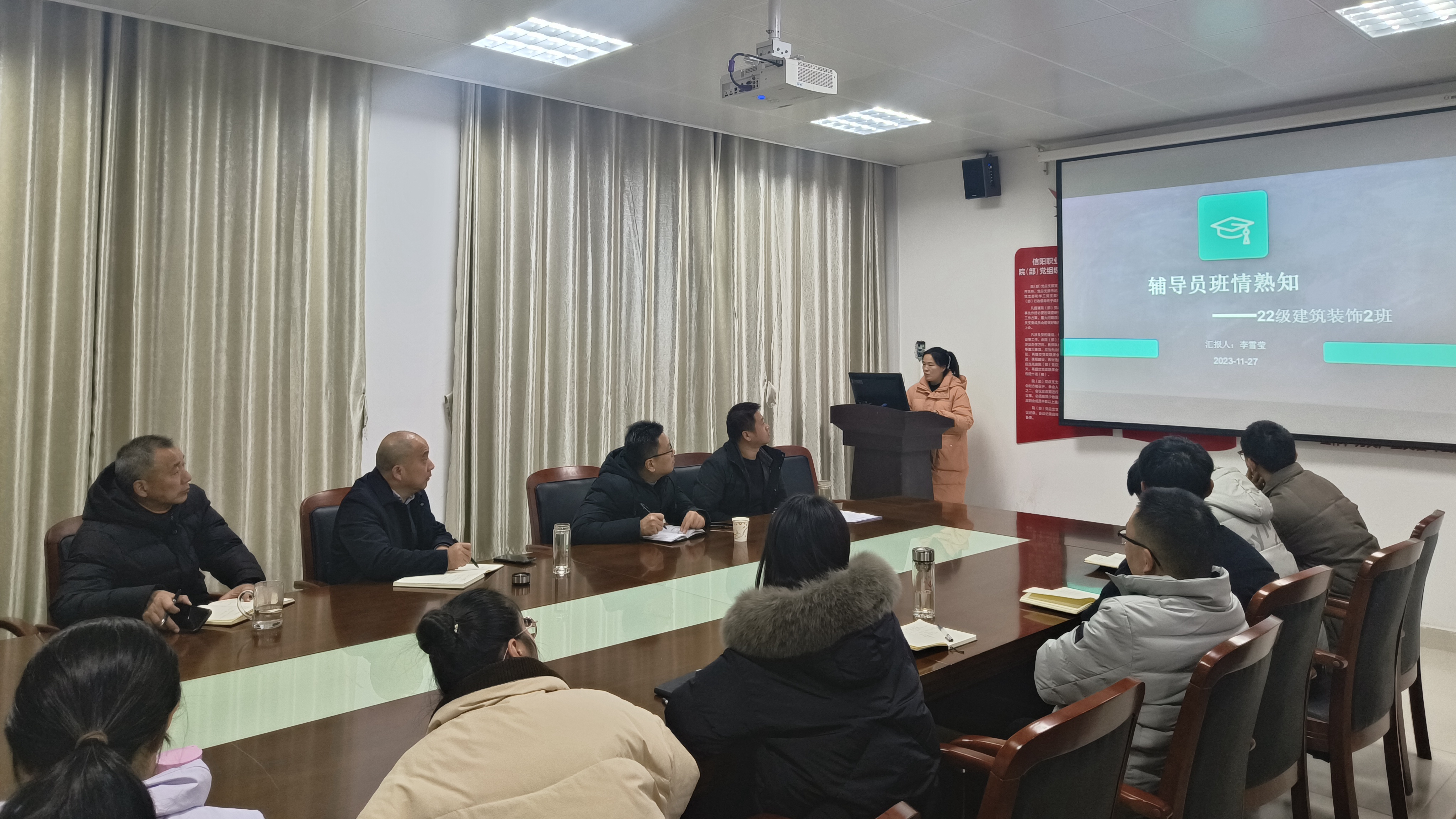 3013会议室,球王会体育官方网站全体辅导员以PPT展示的形式,依次做了班级管理情况汇报。期间,黄新围绕日常管理、安全教育、思想引领、就业指导等工作,向辅导员进行随机提问,各辅导员能做到将班情、学情熟记在心。