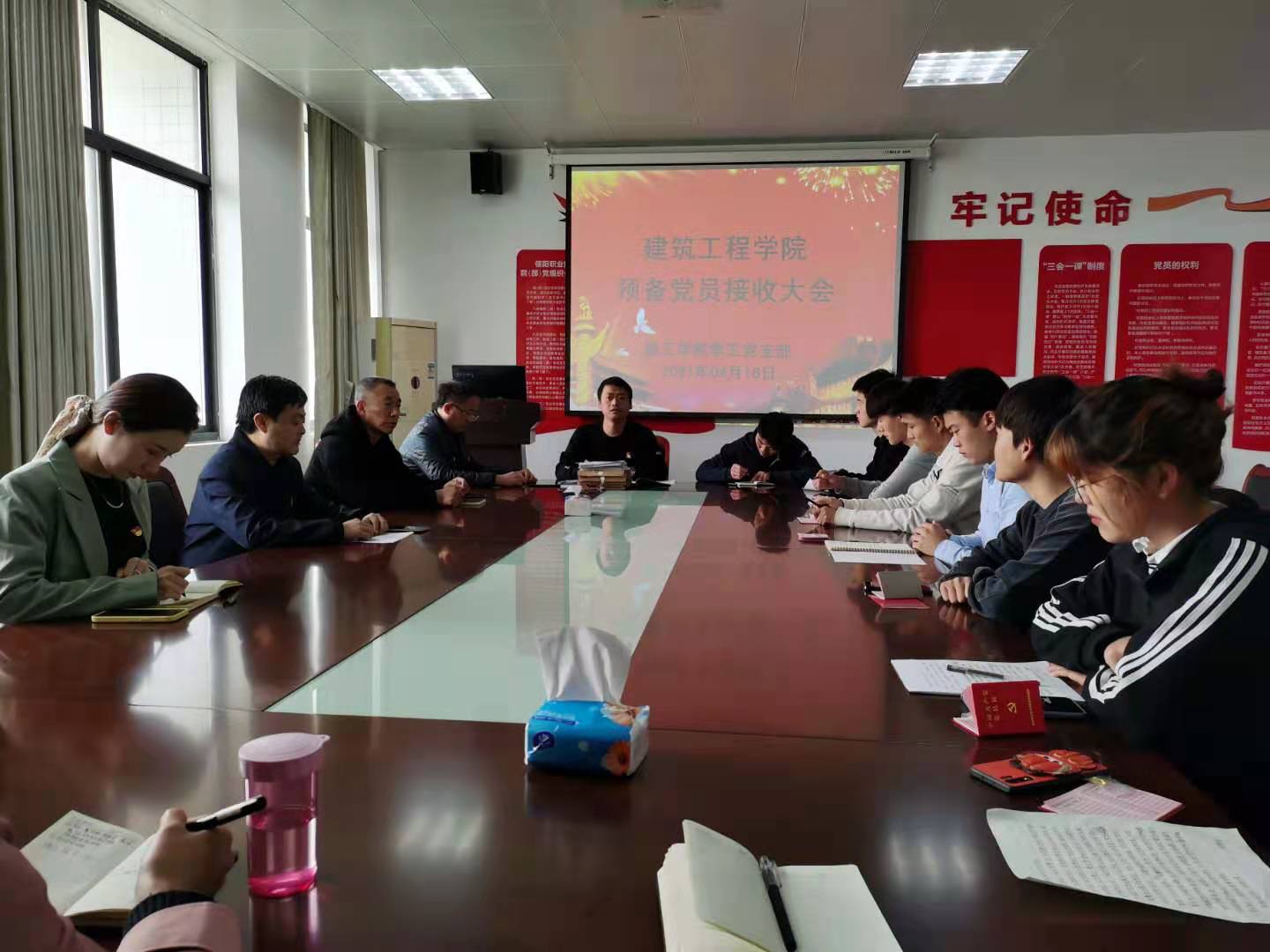 4月16日,球王会体育官方网站学工党支部在3013党员活动室,召开了2021上半年学生预备党员接收暨入党宣誓大会。党总支书记孟朝晖、学工党支部书记徐昊及学工党支部全体党员教师参加会议,会议由学工党支部组织委员董晶主持。