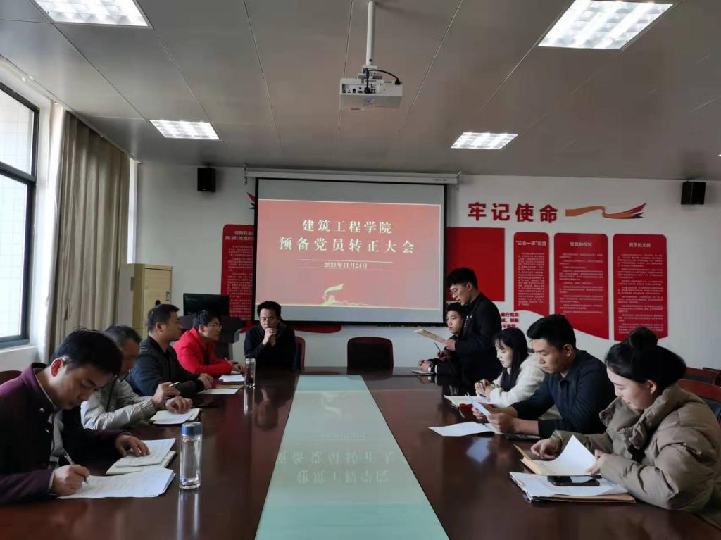 11月24日下午,球王会体育官方网站学工党支部在3013党员活动室召开了学生预备党员转正大会,建工学院党总支书记孟朝晖、学工党支部书记董晶和支部全体党员教师参加会议。会议由学工党支部组织委员李何主持。
