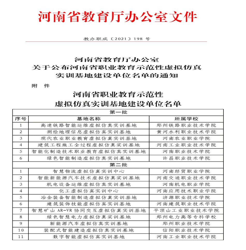 根据教育部《关于开展职业教育示范性虚拟仿真实训基地建设的通知》(教职成司函[2020]26号)和《河南省教育厅办公室关于开展河南省职业教育示范性虚拟仿真实训基地建设工作的通知》(教职成函[2021]360号)的要求,从2021年6月底开始球王会体育官方网站积极组织相关专业老师,依托球王会数字化实训中心建设,同时根据球王会专业特色并结合当下建筑市场趋势,认真准备申报材料,最终按照文件要求完成申报工作。省教育厅通过组织专家进行资料审查,综合评审,最终确定球王会装配式智能建造虚拟仿真实训基地参加河南省职业教育示范性虚拟仿真实训基地建设工作。