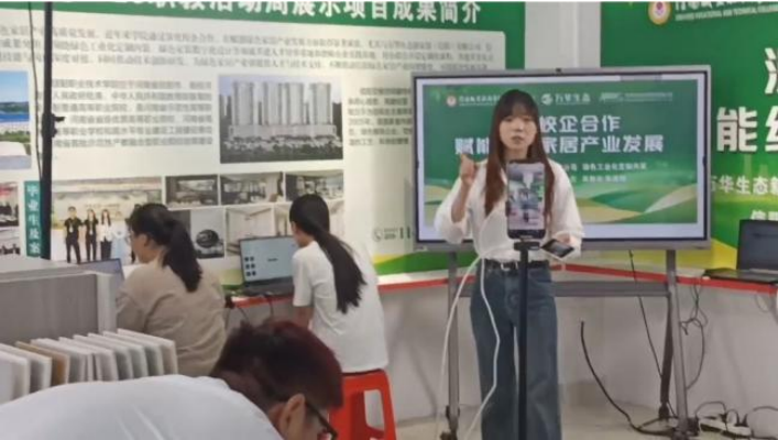 球王会体育官方网站展区邀请了信阳交换空间装饰有限公司和万华生态新家装(信阳)有限公司两家合作企业。万华生态集团展示了家装装配式预制模块及人造生态板材,这些展示内容不仅吸引了众多参观者的目光,也体现了建筑装饰行业的高效、环保发展趋势。信阳交换空间装饰有限公司则将“直播设计工坊”搬至现场,通过直播,企业直观地向观众解析了装修全流程和装修新工艺,让参观者能够近距离了解建筑装饰行业的实际操作过程。这种创新的展示方式不仅展示了企业的实力,也体现了学院与企业深度合作的成果。